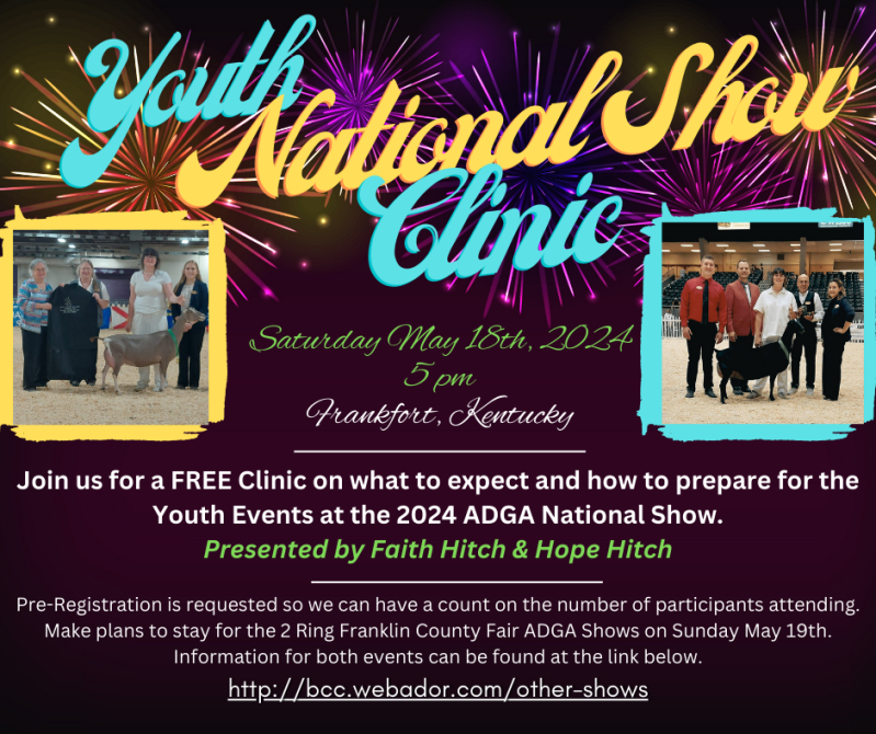 ADGA Youth Age is: under 20 years old on show day. The rules do not specify a minimum age. *We are working on getting information to clarify that information.